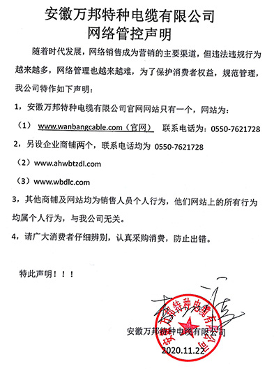 鄭重聲明:安徽萬邦特種電纜有限公司官方網站為:www_wanbangcable_com.37334.cn,除此之外無任何子網站或合作網站,其余均為假冒偽劣。電話:0550-7621728 13485756353 地 址:安徽省天長市滁州高新技術產業開發區經四路29號